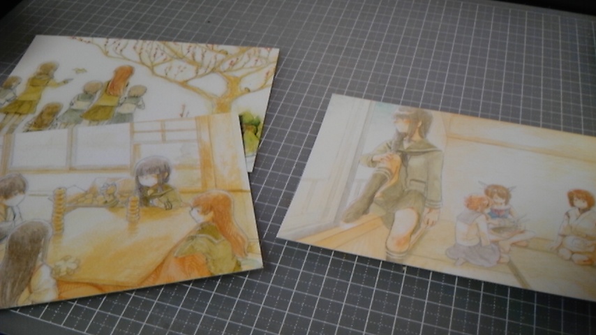 左2枚がポストカードセットで、右の表紙と同じ柄のモノが新刊に付けるおまけになります。